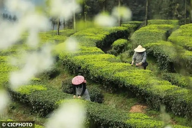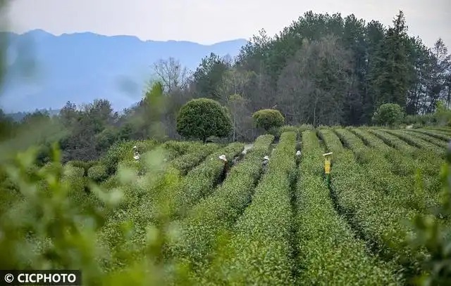 ↑2026年2月27日,茶农在四川省泸州市纳溪区长坡茶园采茶。CICPHOTO/王长育 摄