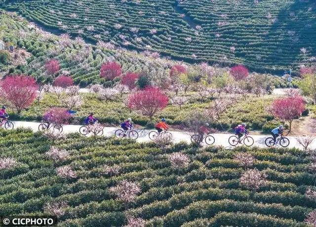 ↑2026年2月21日,自行车运动爱好者在安徽省芜湖市繁昌区孙村镇梅冲村的茶园里骑行游玩。(无人机照片)CICPHOTO/鲁君元 摄编辑:马兰