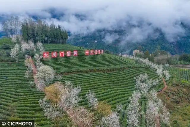 ↑2026年2月27日,在四川省绵阳市北川羌族自治县擂鼓镇,人们在盖头山茶园赏景游玩。(无人机照片)CICPHOTO/杨建 摄