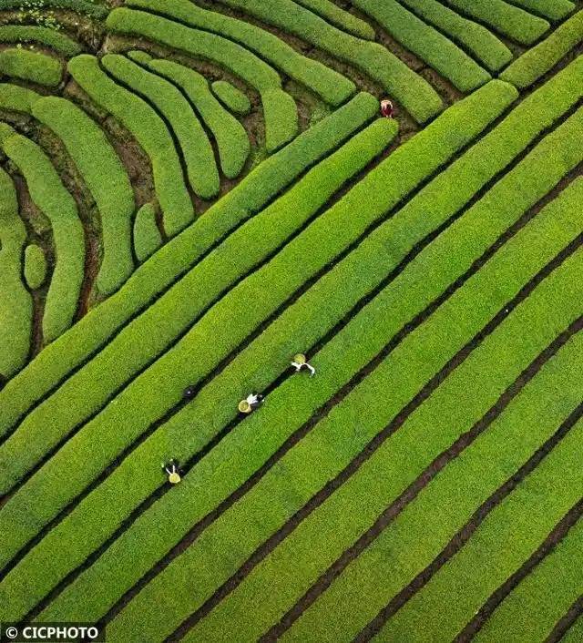 ↑2026年3月15日,在四川省乐山市沐川县利店镇,茶农在茶园采茶。(无人机照片)CICPHOTO/孔胜 摄