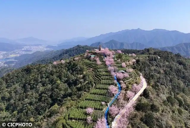 ↑2026年3月12日在安徽省黄山市徽州区谢裕大茶博园拍摄的樱花映衬下的茶园。(无人机照片)CICPHOTO/施亚磊 摄