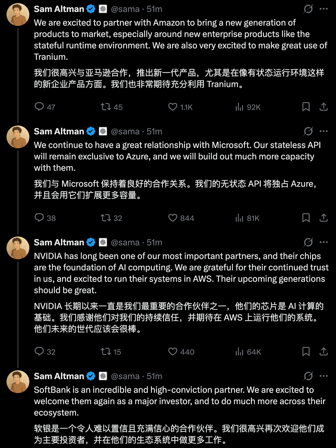 阿尔特曼称,OpenAI很高兴与亚马逊合作,将新一代产品推向市场,期待能够充分利用Trainium芯片;英伟达一直是OpenAI的最重要合作伙伴之一,其芯片是人工智能计算的基石,很高兴能在AWS上运行他们的系统,对英伟达新产品很期待;软银是优秀合作伙伴,很高兴其再次成为OpenAI重要投资方,期待展开更广泛合作。